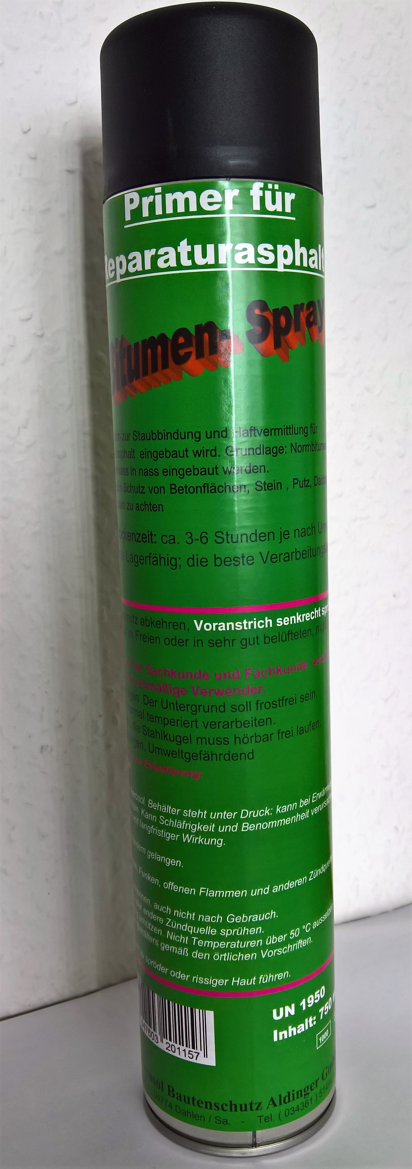 Lösungsmittelhaltiger Primer als Bitumen-Spray zur Staubbindung und Haftvermittlung für Untergründe bei denen Reparaturasphalt eingebaut wird. Grundlage: Normbitumen und Haftverstärker. Der Reparaturasphalt kann sofort nass in nass eingebaut werden.